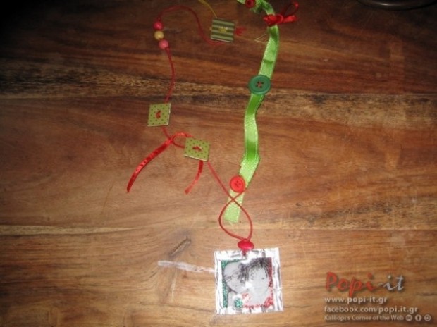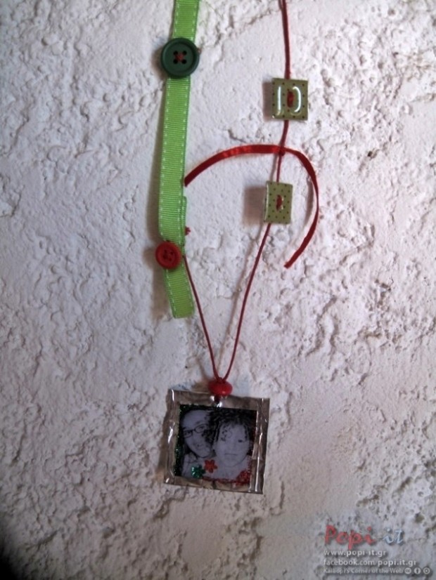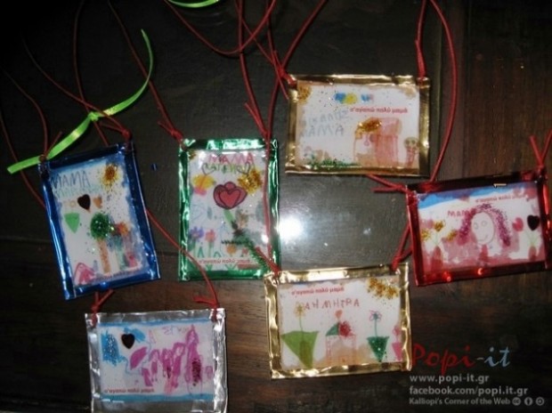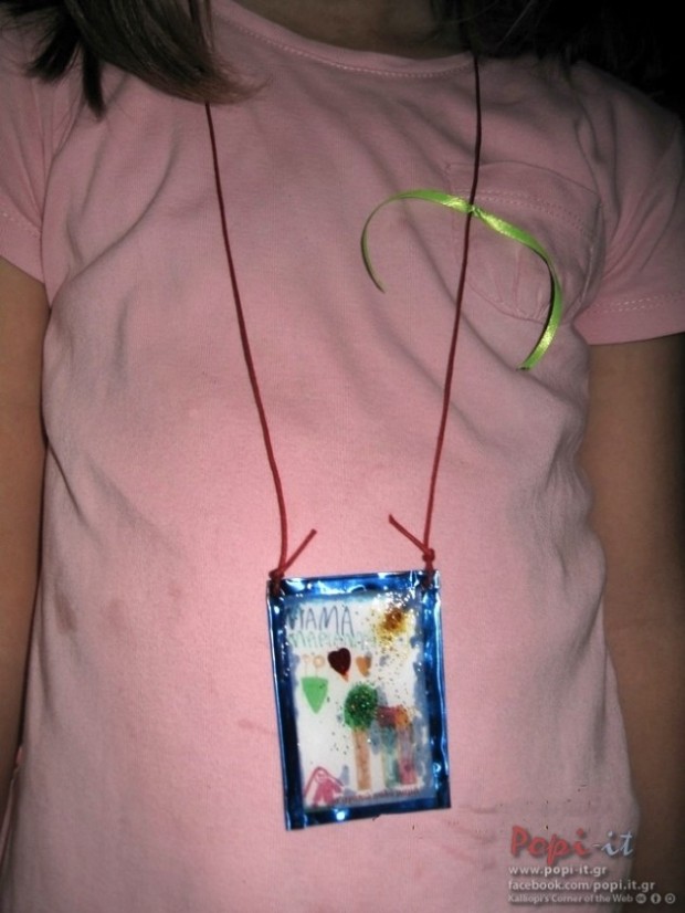 Μπορούμε να βγάλουμε μία φωτογραφία το παιδί ή την μητέρα με το παιδί , να την κολλήσουμε σε ένα φύλλο αλουμινίου και να την καλύψουμε με υγρό γυαλί . Βάζουμε κορδόνι στολισμένο με κορδέλες , κουμπάκια ή ότι άλλο θέλoυμε και έτοιμο το μενταγιόν .