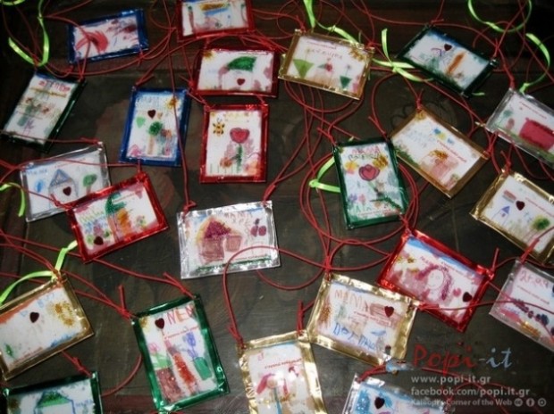 Κάτι αντίστοιχο μπορεί να γίνει με ζωγραφιές των παιδιών τις οποίες θα έχουμε σκανάρει και διαμορφώσει το μέγεθός τους κατάλληλα . Εναλλακτικά βέβαια αντί να βάλουμε υγρό γυαλί μπορούμε να πλαστικοποιήσουμε τις “μικρές” ζωγραφιές των παιδιών ή να τις κάνουμε καρφίτσες .