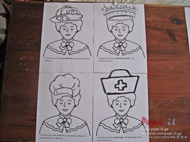 Επίσης μπορείτε να φτιάξετε μια φιγούρα με την μητέρα που θα φοράει διάφορα καπέλα και τα παιδιά θα προσπαθούν να βρουν το κατάλληλο καπέλο για να της το φορέσουν (αρχική ιδέα από εδώ Hats Off to Mother). Στο κεφάλι της κάθε φιγούρας-μητέρας κάνουμε μια εγκοπή για να μπαίνει το αντίστοιχο καπέλο.