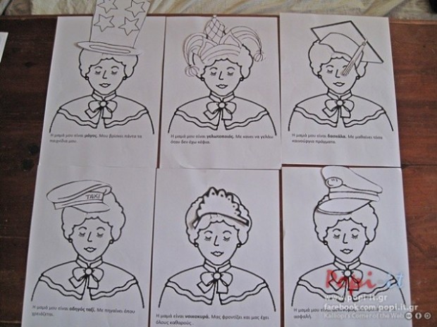 Το κάθε παιδί μπορεί να τα συμπληρώσει , να ζωγραφίσει την μαμά του με κάθε καπέλο και να της χαρίσει το βιβλίο .
