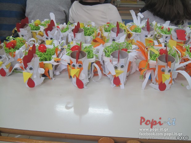 Τα καλαθάκια μας φέτος έγιναν από άδεια κουτιά φέτας που μας έφεραν οι γονείς και ρολά από χαρτί τουαλέτας. Διακοσμήθηκαν από τα παιδιά με λωρίδες απλού χαρτιού πολυγράφου σε διάφορα χρώματα, οι οποίες σκίστηκαν με το χέρι.