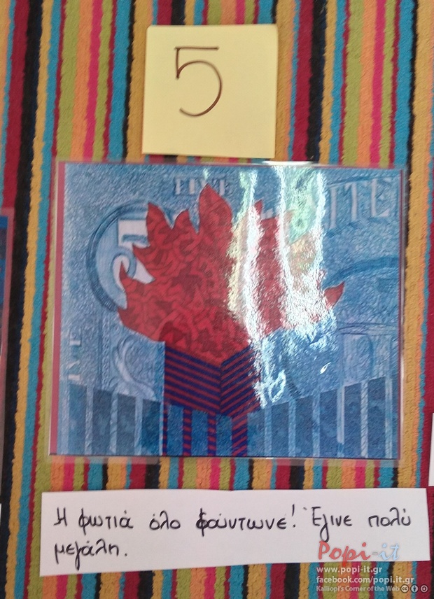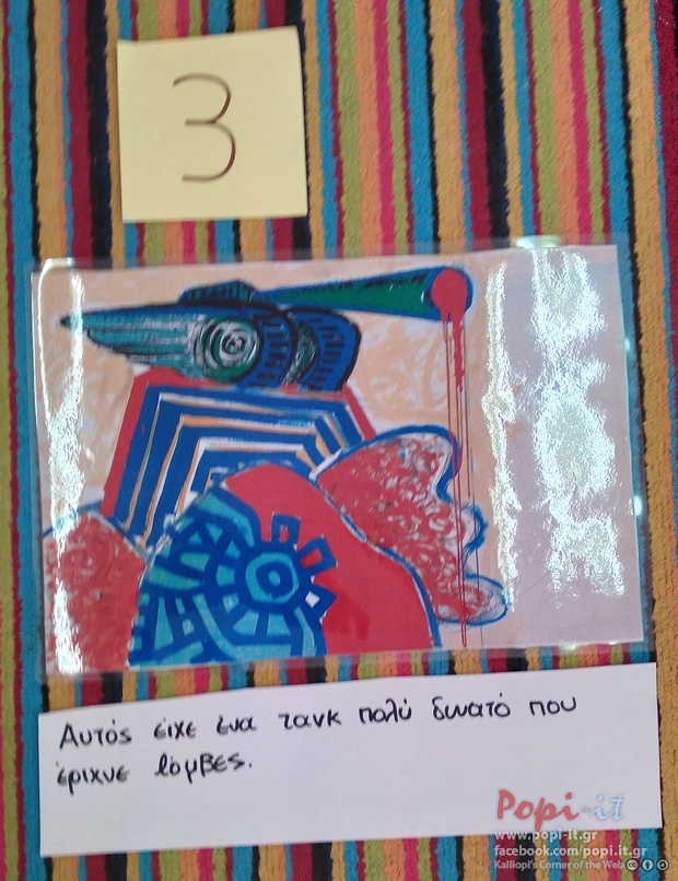 Συμφωνήσαμε να δημιουργήσουμε και μεις μία ιστορία με πίνακες τους. Χρησιμοποιήσαμε τους τρεις που είχε μέσα η βαλίτσα και επιλέξαμε και μερικούς ακόμα ! Προσπαθήσαμε να τους βάλουμε σε μια σειρά, πειραματιστήκαμε αρκετά. Δημιουργήσαμε διάφορες ιστορίες αλλά καταλήξαμε σε μία.
