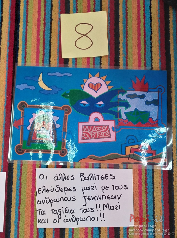 Στο τέλος δημιουργήσαμε μαζί με τα παιδιά τη Βαλίτσα της Δημοκρατίας επηρρεασμένοι από τις βαλίτσες του Ακριθάκη! Αρχικά κάναμε την τεχνική «Τσίκι τσίκι» σε άσπρο χαρτί και στη συνέχεια κόψαμε και βάψαμε σχήματα και σύμβολα που χρησιμοποιεί ο Ακριθάκης στα έργα του! Διαλέξαμε το βέλος την καρδιά και το καράβι !