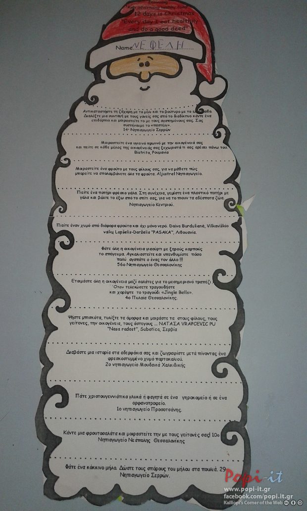 Σε αυτή τη δράση θελήσαμε να εμπλέξουμε και την οικογένεια στο πρόγραμμα κατά τις Χριστουγεννιάτικες διακοπές ! Δημιουργήσαμε ένα ημερολόγιο αντίστροφης μέτρησης για 12 μέρες πάνω στην γενειάδα του Άι-Βασίλη με πράξεις καλοσύνης αλλά και με υγιεινές διατροφικές προτάσεις.