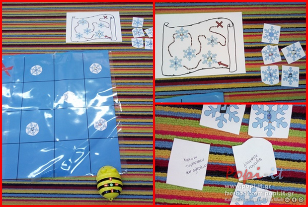 Χάρτης θησαυρού με χιονονιφάδες για το Beebot. Δημιουργήσαμε έναν χάρτη θησαυρού με διάφορες εντολές σε κάθε σταθμό της διαδρομής μέχρι το τέλος ..που άραγε τι θα βρούμε για θησαυρό ;