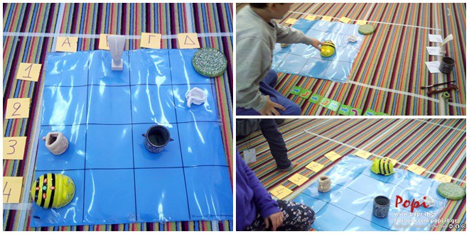 Στο χαλί του Beebot που έχει την μορφή πίνακα διπλής εισόδου και μας θυμίζει τον αρχαιολογικό κάνναβο, προσθέσαμε οριζόντια γράμματα και κάθετα αριθμούς. Στη συνέχεια μέσα στα «αρχαιολογικά» τετράγωνα του χάρτη τοποθετήσαμε διάφορα «αρχαιολογικά εκθέματα» από το μουσείο μας.